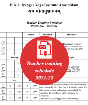 Previous yoga experience in the Iyengar method is required. The training demands great dedication from the student. In an introductory conversation and a yoga lesson, it will be assessed if the student is “ripe” to participate in the training. A student with a minimum of 2-3 years of weekly classes with a certified Iyengar Yoga teacher and daily practice that includes head and shoulder stand are welcome to apply. In some instances, candidates will be asked to follow one or several preliminary classes from an appointed teacher for adjudication. As well, students should become members of the Dutch Iyengar Yoga Association to train as a teacher. All candidates will be interviewed. Neither age nor any training other than a commitment for Iyengar yoga is relevant. Participants in the training program sign a year contract with the B.K.S. Iyengar Yoga Institute Amsterdam, which is to be renewed for the second and third years.